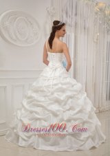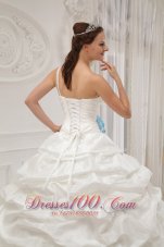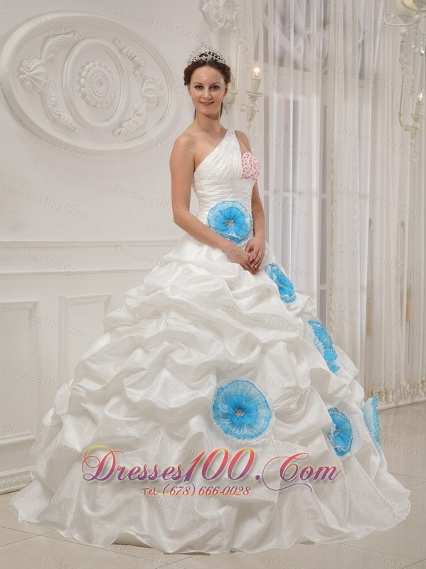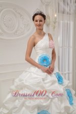 This quinceanera dress is creative. Its one-strap bodice boasts clusters of sparkling accents, and it is bordered by a slanted neckline and a dropped waistline. The simple silhouette of the top contrasts boldly with the dramatically flared skirt, which tumbles to the floor in cascades of chic pickups and oversized rosettes throughout. You will feel gorgeous for a quincinera or special night in this gown.