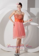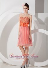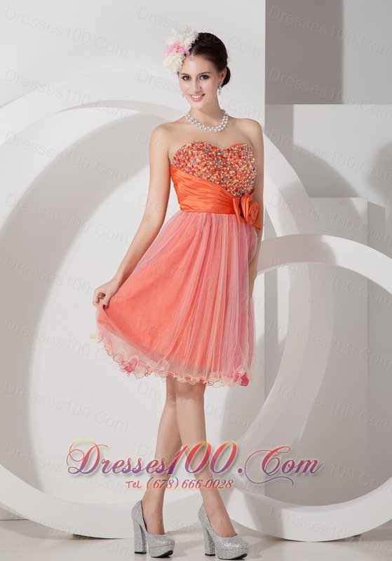 Twirl and whirl your way to an unforgettable evening in this strapless nini dress! Its fitted sweetheart bodice is completely coated in fine, shimmering, multicolored accents. The waist is boasted wonderfully with a delicate flower on the ruched waistline contrasting to the gorgeous flower decorated on the beauty's head. Layers of diaphanous material flare out on the short skirt. The back is fitted with zipper up.