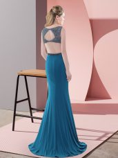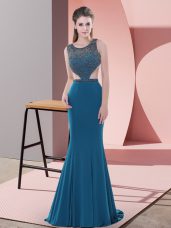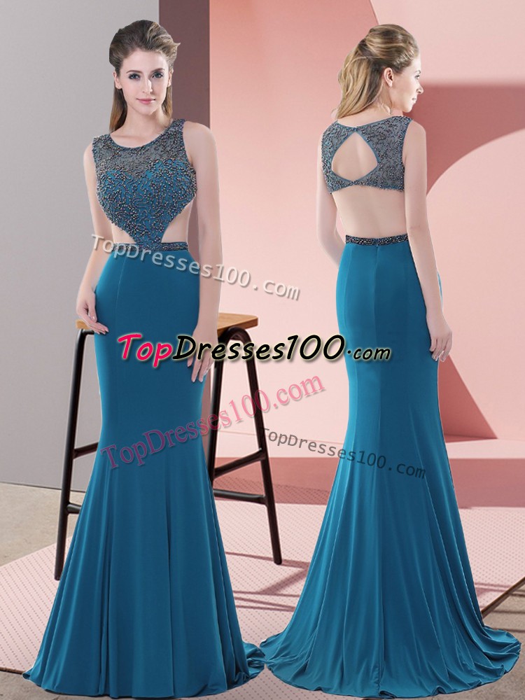Custom Made Blue Scoop Backless Beading Prom Dresses Sweep Train Sleeveless