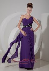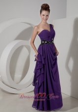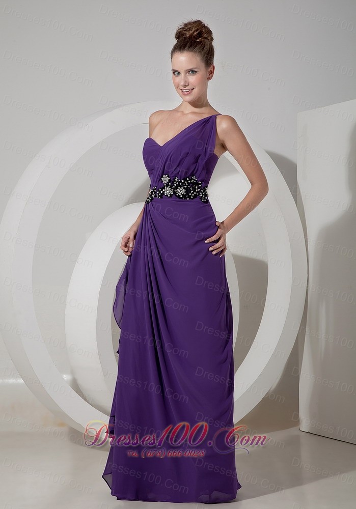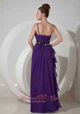 This purple gown features one shoulder strap that is encrusted with ruched details on the bodice. A coordinating waist sash adds interest and detail to the mid-section of the dress. The floor-length skirt with two bands create a beautiful shape to complete the dress. A bit retro and a lot gorgeous!
