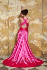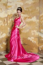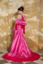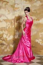 This gown features a sweetheart halter neckline that is encrusted with ruched bodice on the front. Soft chiffon creates an interesting handkerchief hem. The bottom of the skirt has lovely ruched details and a train. A bit retro and a lot gorgeous!