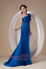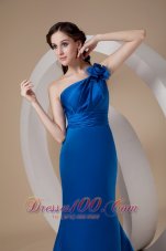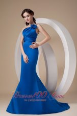 Simply gorgeous of this royal blue prom dress. This mermaid style dress features a gorgeous one shoulder bodice that's embellished with one shoulder neckline and exquisite ruching decorations, while the single strap is also well decorated with a chic handmade rose. The floor-length skirt is so smooth and elegant that extends into a lovely brush train in the back. The open back can show your beauty and a zipper up completes this fabulous design!