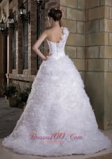 A very special dress for your unique wedding! This sweetheart neckline white wedding dress is featured with one shoulder strap decorated with organza flowers. The ruffles on the whole puffy skirt which also extends to the back to be a sweeping train add to the dress great grace and elegance, and will make you the most eye-catching bride. This gorgeous dress also shines with the bust and broad waist ruched to contours your beautiful figures. The hidden zipper on the back allows easy off and on.