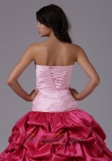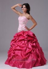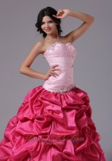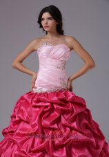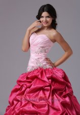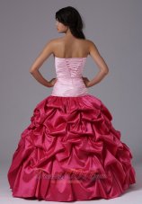 Matching dress with two sharp contrasting color designs are becoming more popular.This coral red and rose pink dress is a gorgeous example of what we mean.Always elegent and always in fashion, this beautiful ball gown has a weetheart neakline with crystals accented. Delicate ruching and shinning beading on the bodice. The skirts full with pick-ups add the fantastic look and give the dress a fulling feeling. The corset style bodice is finished with a lace up tie back.
