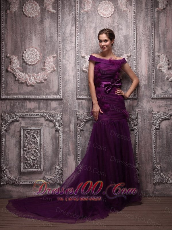 Prom night is meant to be special and in this gorgeous gown, you can be sure it will be. It's made in a sheath style with a off shouder neckline and an elegant ruched pattern throughout. The waistband with bow and the tulle flower on the dress acheives a lovely look. The bodice hugs your frame until just about the hem where the straight skirt begins and finished with a train. It has a nice tulle-like overlay for added detail. The zipper up back finishes the look. Simple and gorgeous!