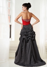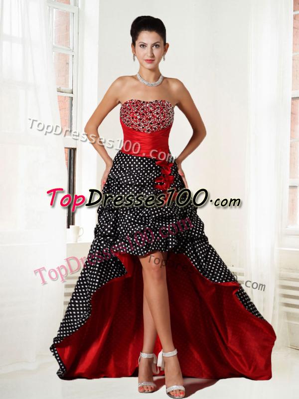This opulent dress is just the ticket for a fun night. This lovely dress with strapless sweetheart neckline is enrusted with lots of flashy bling on the bust and a wide ruching band contours your curve greatly. The high low ruffled skirt with flower embellishements made by wave point fabric let you show off a seductive curve. A zipper up closure secures the dress in place. This design will have heads turning as soon as you arrive.