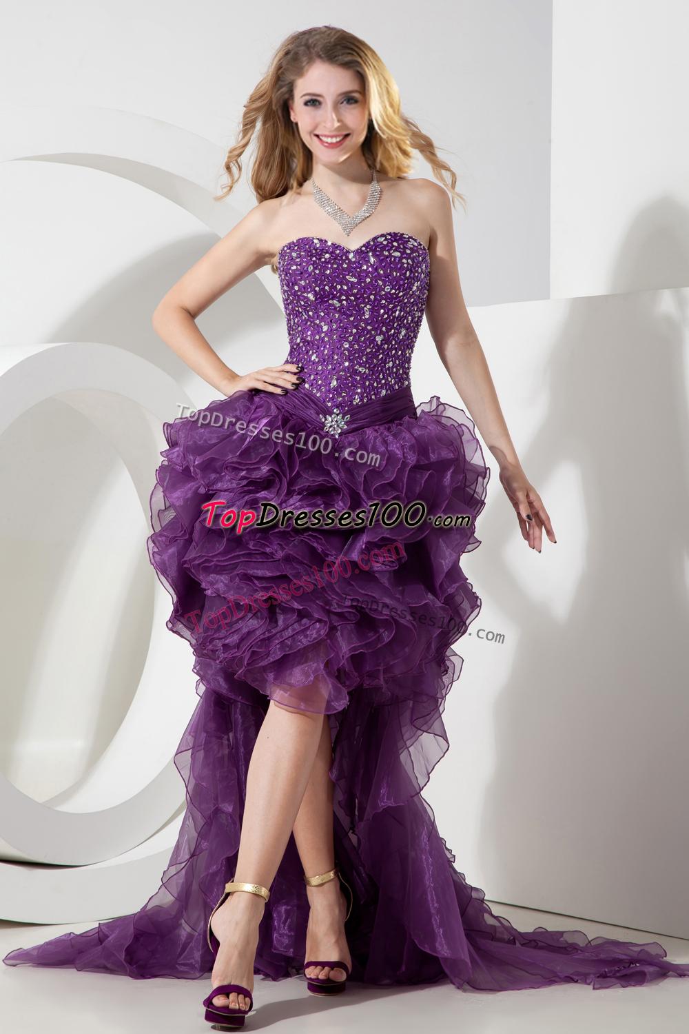 This short style is sure to wow! The crystals and bead works on the form-fitted bodice throughout makes you be the lightspot wherever you are. A pleated waistband with crystals gathered in the midsection is more girly. What makes this already shimmery dress more sexy and charming is the high-low skirt accented with multi-tiered ruffles in amazing organza. A brush train on the back will show off your passion. The zipper up closure finishes the fabulous look. You can dance the night away in this distinctive dress!