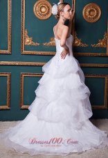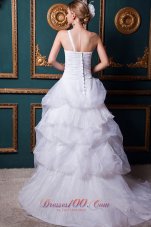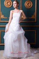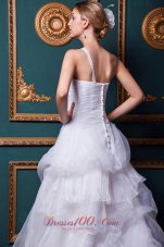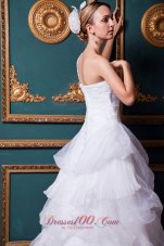 Strapless dresses are one of the sexier styles on the market today. They show just enough skin to be classy without being too revealing. This one features a lovely beaded one shoulder style and the ruching bustline. The amazing A-line skirt is reminiscent of the old fashioned hoop skirts and is made from several layers of pieced fabric that adds another dimension of beauty to an already lovely gown. The dress sways beautifully across the floor when you move, as if you're floating on air. A lace up corset style closure in the back secures the dress in place.