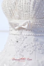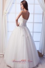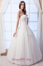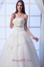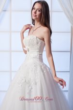 The richly detailed design of this ravishing A-line gown will blow your mind! Floral patterns are embroidered all across this sublime dress, whose bodice fits closely and is topped off by a simple neckline with shimmering edging. Glittering beads and appliques are sprinkled across this strapless dress and run across its flared, floor-length skirt.