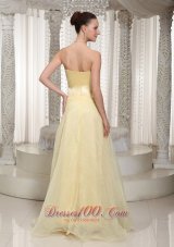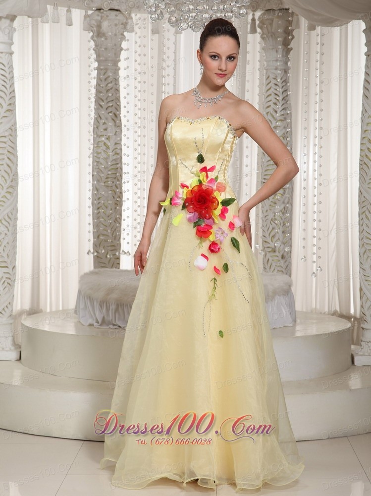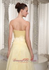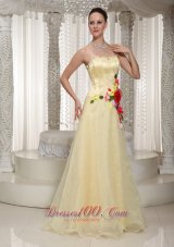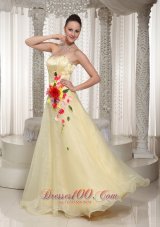 This amazing designed yellow long prom dress features a strapless bodice with a sweet heart neckline and highly beaded bust line. The boning detail contours you slim figure while the flower embellishments can really catch a spotlight in the crowd. The light-weighted skirt flows freely to the floor. A hidden zipper up closure secures the dress in place.