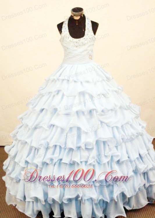 The halter top ball gown dress is amazing with beading all long the strap and ruched waistband that curves the waistline properly. Full skirt features tiered vertical ruffles.