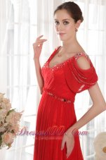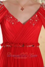 Gorgeous chiffon gown! This elegant v-neck off shoulder dress is stunning with silver stones in shoulder and bust part.The ruffled waist band trims with beading.An elegant chapel train that cascades to the floor and deep V-back makes you flattering.