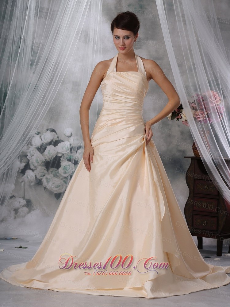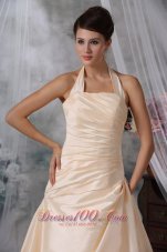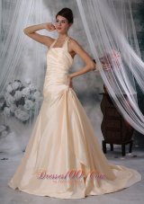 Chic and modest, this elegant dress is a great choice for a party. The fashionable halter-styled neckline makes this style fresh and modern. And the ruched fabric will definitely conture your figure. The floor length skirt is so simple yet gorgeous with a chapel train. Made from a define fabric, this style will shimmer and shine all day long. A button up back adds more charming to the dress.