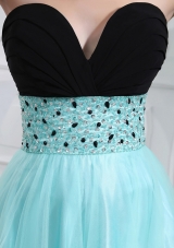 aqua blue prom cocktail dress with beading and ruching |