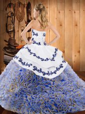 Custom Made Sleeveless Satin and Fabric With Rolling Flowers With Train Sweep Train Lace Up Vestidos de Quinceanera in Multi-color with Embroidery