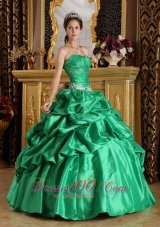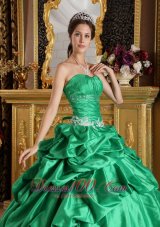 Wearing this green gorgeous strapless quinceanera dress will make you look like a princess. It features a weetheart neckline and a bodice with pleated bust and beaded bustline. The waist part is adorned with ruchings and the dropped waistline is decorated with embroidery. The skirt is great at hiding full hips and creating a gorgeous hourglass figure.