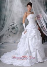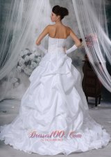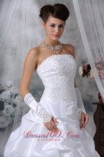 This gown has an elegant and glamorous appeal. A strapless bodice features a lace overlay which is so exquisite and graceful. For the skirt, the pick ups adds delicate to the dress and the hand-made flower on the side gives a touch of romance, while the appliques on the skirt match the top in pattern. Have you ever dreamed to be the fairlady in your big day? This dress will be your best choice.
