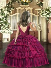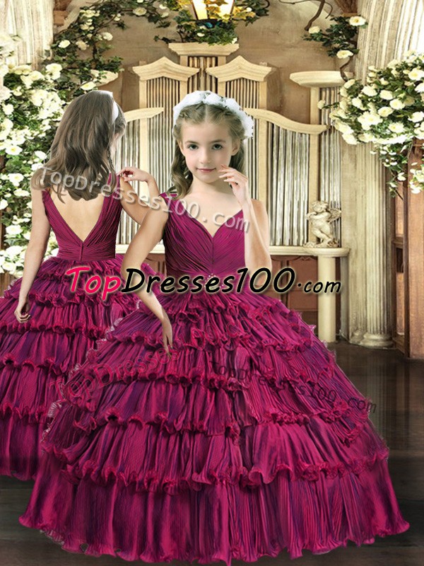 Home >  Wedding Apparel >  Flower Girl Dresses >  Beautiful Little Girl Pageant Dresses > Eye-catching Fuchsia Ball Gowns V-neck Sleeveless Beading and Ruffled Layers Floor Length Backless Kids Pageant Dress
