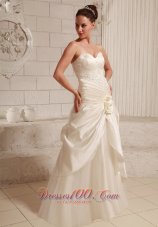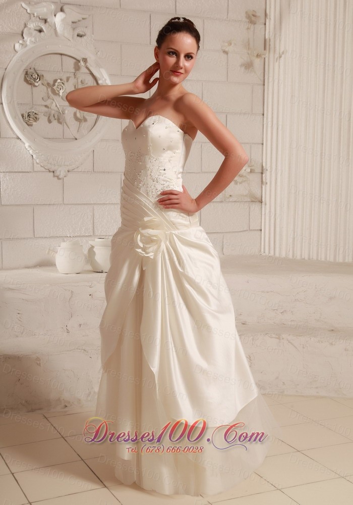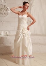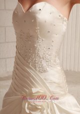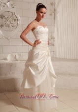 Put a bit of sparkle in your step with this fabulous designer inspired wedding gown. It has a strapless bodice that has been heavily embellished by beaded embelishments. The accents continue through the right of the waist which is fitted. They also extend into the beautiful floor-length skirt. The front of the skirt is ruched and has some ruffles. A hidden zipper on the side makes for easy off and on and secures the dress in place. This is a fantastic dress that would look great for any occasion, function or event.