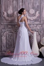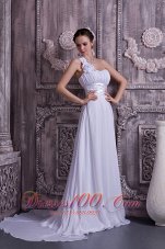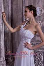 Elegant yet notable. The wedding gown features a one-shoulder sweetheart neckline and a A-line floor-length skirt. The wide ruched strap secure the dress in place. And a crosswise ruched band decorates the waist and represents your slim line. The ruched bodice adds the nicely look. The fllower on the bust will surely be the lightspot. Also the back is designed with lace up to make the dress easy off and on. This soft and gorgeous dress will be the choice for countless women for wedding or other formal occasion.