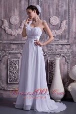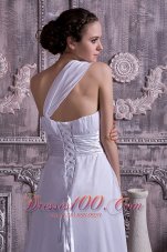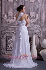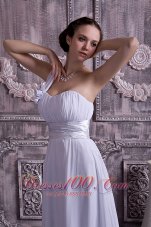 Elegant yet notable! The wedding gown features a one-shoulder sweetheart neckline and a A-line floor-length skirt. The wide ruched strap secure the dress in place. And a crosswise ruched band decorates the waist and represents your slim line. The ruched bodice adds the nicely look. The fllower on the bust will surely be the lightspot. Also the back is designed with lace up to make the dress easy off and on. This soft and gorgeous dress will be the choice for countless women for wedding or other formal occasion.