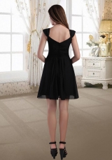 This black mini-length bridemaid dress has all the elements to make it a classic. The dress features fashionable straps and a sexy V-neck which add interest to the bust. Exquisite ruching accents your waist and gives a slimmer apperance.Soft chiffon mini-skirt flows freely to the knee. A zipper up back completes the whole look. Both elegant and snappy!