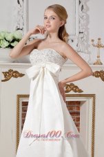 This gown is perfect for those who want to be eye-catching all the time. You really can't miss it! The smooth taffeta material makes the dress stunning. The sweetheart neckline is heavily embellished with beaded appliques. Ruched band with a big bow accents your waist. The waterfall-like skirt flows naturally. A classic lace closure makes the dress well fitted.