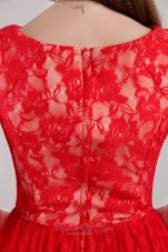 The elegant red mother of the bride dress features a bateau neckline and has mid-length sleeves. The bodice is ruched and the whole dress is decorated with lace embroidery. A zipper up closure completes the wonderful silhouette. This is sure to make all of your dreams come true!
