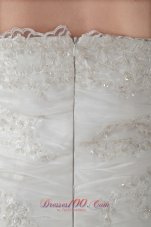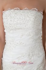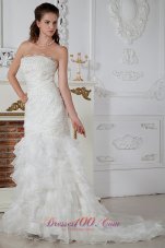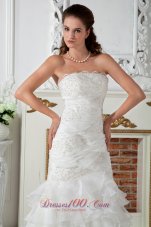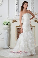 If there is a kind of fabric that ever girl want to wear, then it must be lace. This fabulous dress features a bandage-like bodice that hugs your curves and has a strapless lacework neckline. Beaded lace fabric accents the whole bodice add lots of interests and details to the design. Layers of ruffles down to the floor and extends into a little train in the back. A simple zipper up closure completes the look and secures the dress in place.