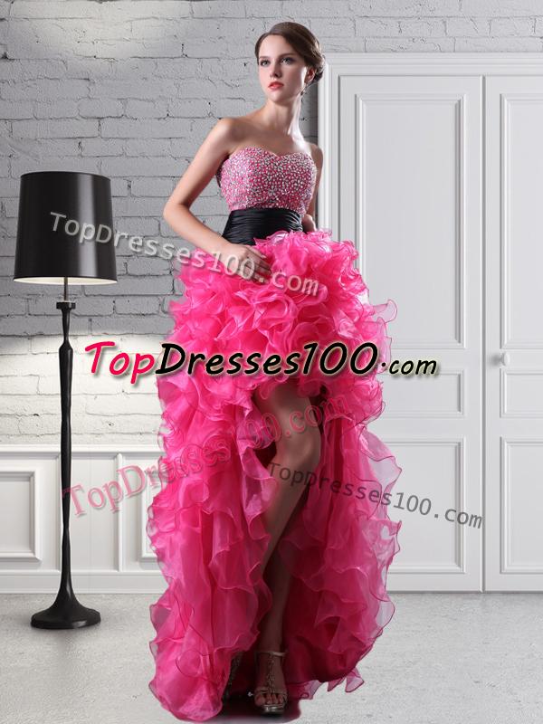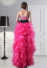If you are looking for a unique dress to help you put your best fashion foot forward – look no further! This gown is definitely on the cutting edge of fashion. It features a sweetheart neckline and a bodice made entirely of silver beads. The midsection of the dress is decorated with a wide blank band. The skirt asymmetrical - short in the front almost resembling a tutu and then floor-length in the back. It accents a lot of ruffles on the skirt. A zipper up corset style closure in the back secures the dress in place. Just a fun and funky dress for those looking for something a bit different.