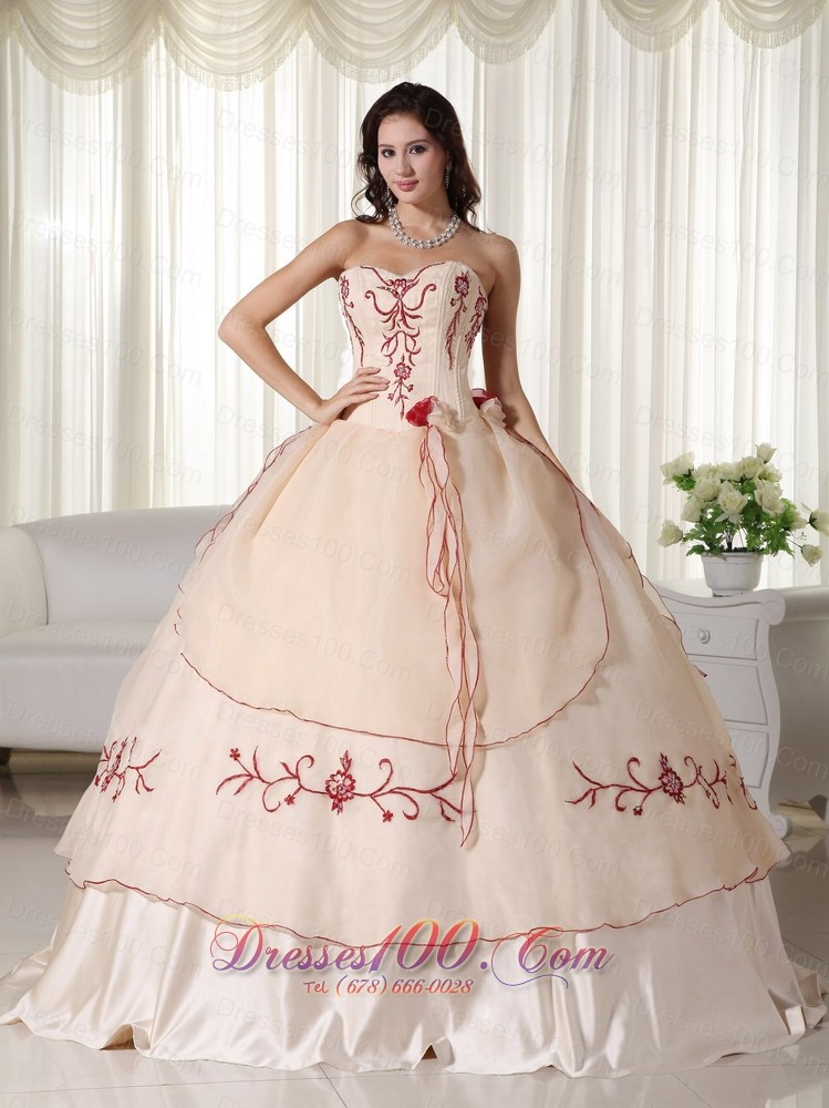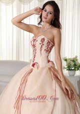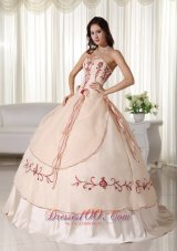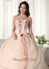 At the first sight of this sweetheart quinceanera dress, you'll fall in love with it. The highlighting view of this fabulous dress lies in the beautiful embroidery on the bodice and puffy skirt. The embroidery is so specially designed that gives the whole dress a perticularly wonderful view. Around the waist, two toned flowers decorate there and their tails flow down to the full skirt to make this dress more elegant and beautiful. The exquisite lace up back fits all figure as long as you want. This gorgeous gown is really the best choice for anyone who want to show her elegance and beauty.