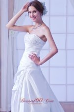 The classical style of clothing refers to a period in French fashion that focused on lightness, opulence and grace. This gown is one example of the this style. It features a beautiful strapless bodice with a ruched waist and beaded embroidery on the bust. The bodice itself is embellished with very ornate beadwork on one side of the hip. The A-line skirt flares out from the hip and is created from many pleats and folds. It pools beautifully at your feet before extending into a sweeping train in the back. The elegant corset back finishes the gorgeous design.