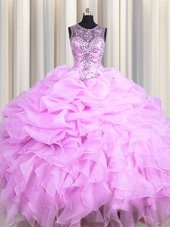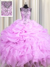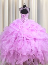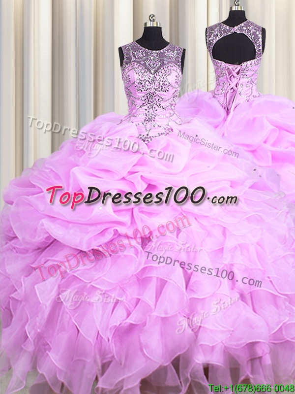 Home >  Quinceanera Dresses >  Classic Quinceanera Dresses > See Through Lilac Organza Lace Up Scoop Sleeveless Floor Length Vestidos de Quinceanera Beading and Ruffles and Pick Ups