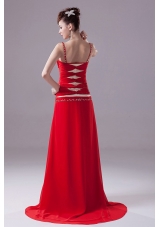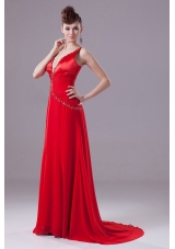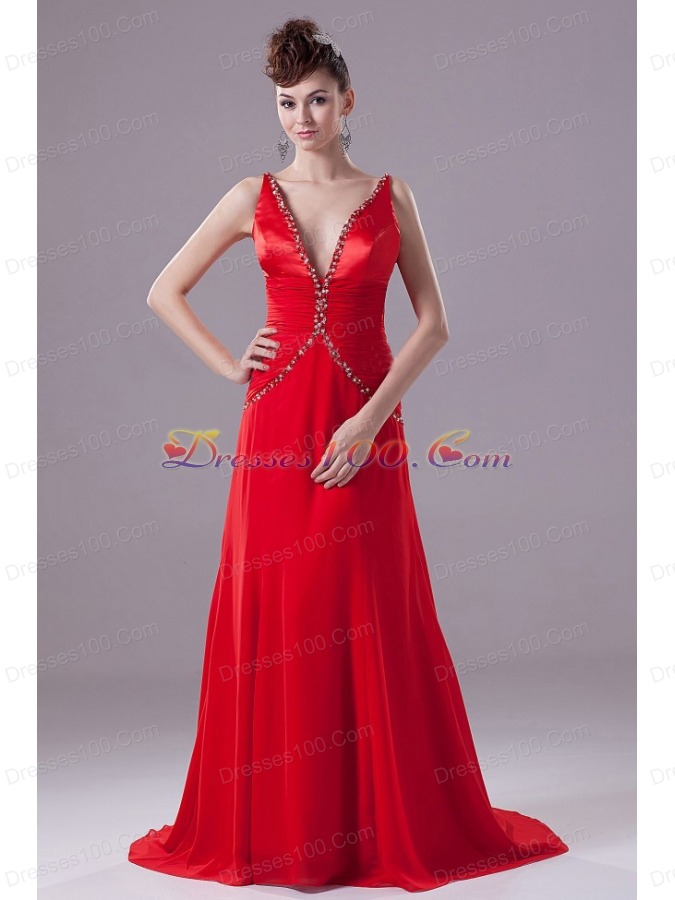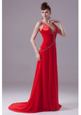 Fairytale-inspired dresses will always be popular because every girl dreams to be a princess. This gorgeous prom dress features a V-shape neckline trimmed with glittering beading. Splendid ruching on the waist flatter most figures. The floor length A-line skirt flows beautifully with a loose fit. It pools beautifully at your feet before extending into a sweeping train in the back.Several diamonds flatter the back will turn heads.