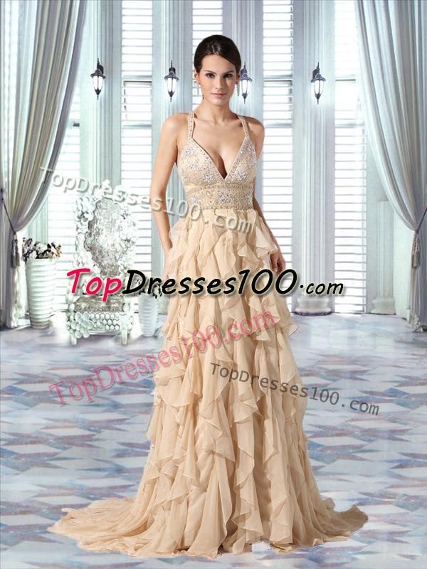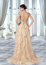 This halter chic prom gown dress must be the dreaming dress you are looking for. Column fitted bodice is highlighted the body curve. The floor-length chiffon prom dress gives you sense of delicate beauty. A fitted, straps bodice made of an all-over embroidery accenting the v-neck neckline. The ruffled skirt is highlighted with the brush train. If you're looking for a high-end dress without the high-end price tag, this is definitely one you should consider.