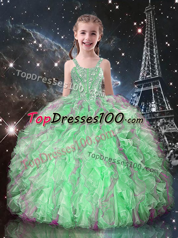Sleeveless Floor Length Beading and Ruffles Lace Up Little Girls Pageant Dress with Apple Green