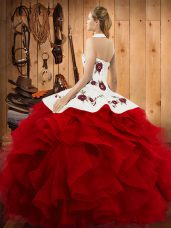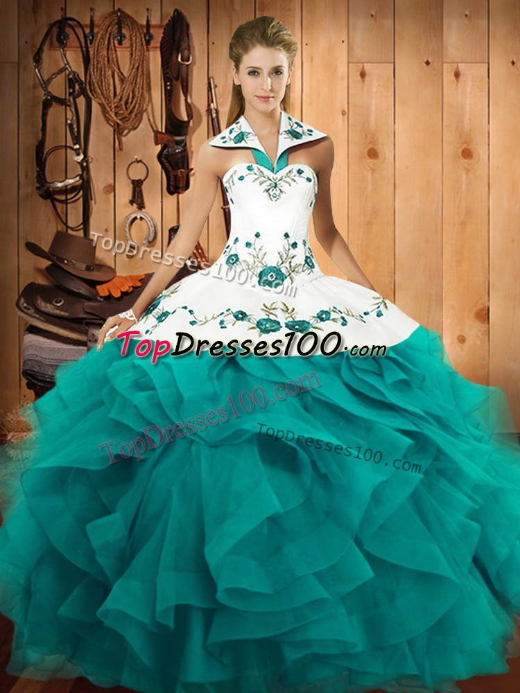 Teal Halter Top Neckline Embroidery and Ruffles Ball Gown Prom Dress Sleeveless Lace Up
