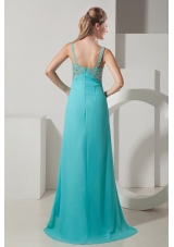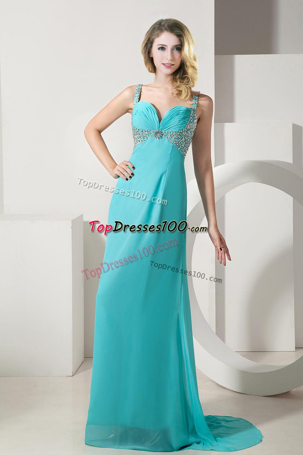 Sexy blue prom dress is perfect for any hot little number! The structured bodice has straps adorned with shining beading and a modified sweetheart to contour your well-toned body. The splendid beading forming tri-angle symmetrically placed around the bottom bustline to back that creats a illusion of a fuller bust. The romantic chiffon skirt falls from the high waist to cascade to floor with a train. A zipper closure back completes a marvelous look.