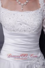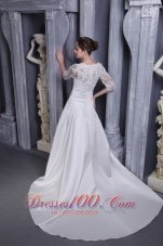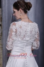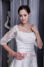 This elegant chapel train wedding dress is perfect for you! Soft and smooth taffeta make this dress looks simple but luxurious. It features a scoop neckline with straps. The ruched bust accentuate your curve. Exquisite lace fabric adorned by beadings decorates the bust part and your back creats a sense of myth. You will not forget the day when you wear this dress!