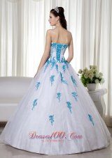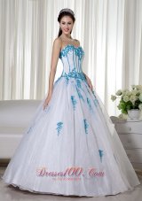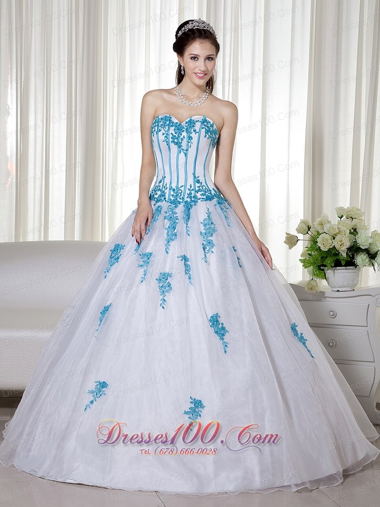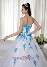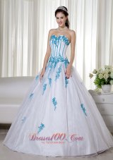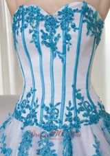 Elegant and alluring! The dress is designed with a strapless sweetheart neckline on the fitted bodice. The blue appliques adds the charm. When you put on the white dress,you will feel soft and feminine. A corset back completes the look.