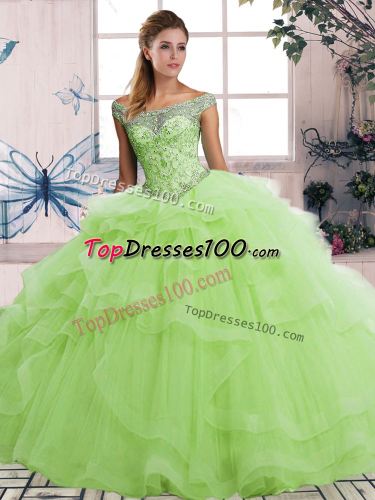 Yellow Green Tulle Lace Up Quinceanera Gown Sleeveless Floor Length Beading and Ruffles